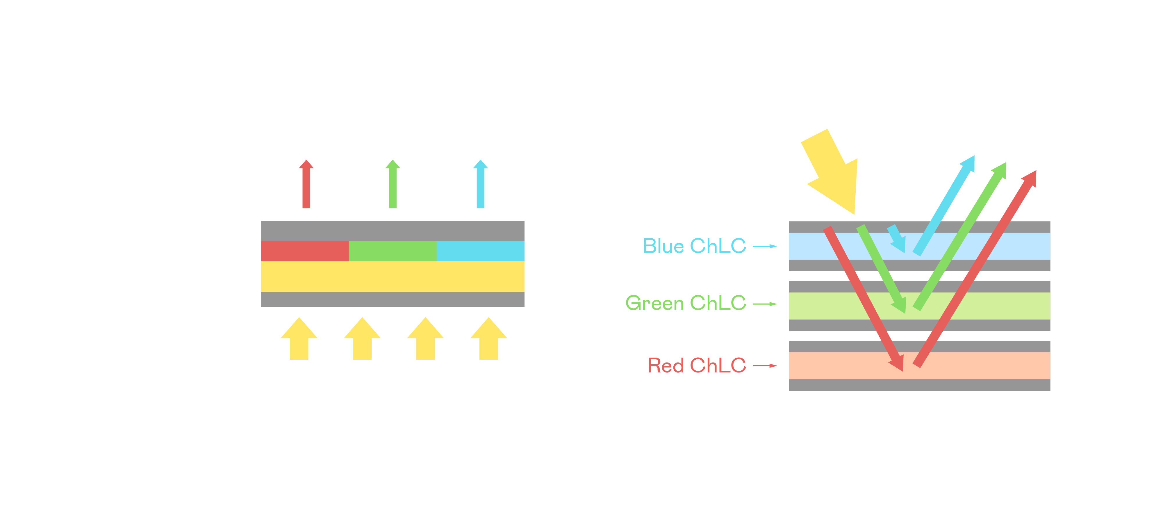 万博膽固醇液晶顯示器是由紅、綠、藍三層膽固醇液晶面板堆疊而成,並採用無彩色濾光片設計,減少環境光在反射過程中的損耗。